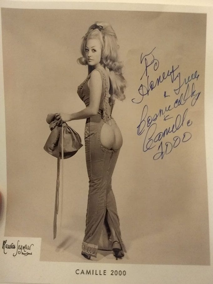 While getting to know my elders whose heyday took place over 40 years ago is a joy and a blessing, it can also be challenging and heartbreaking. Over the past several years, many of the burlesque legends I’ve known and loved have passed on, and it never gets easier. On my birthday, I’d like to remember my fellow Leo and birthday twin, Camille 2000, who rocked on over to the other side in 2019.